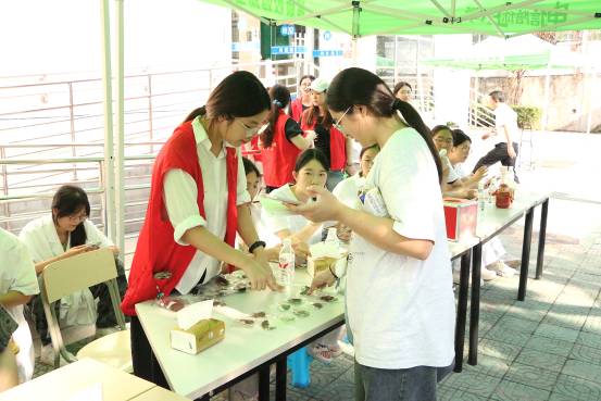 本次迎新,医学院还特地为新生准备了“医心传古艺,本草铸新香”主题迎新活动。按要求打卡拍照,完成规定数量的集赞,新生就能参与百分百中奖的现场抽奖,获得我校创业大学生制作的合香梳、合香手串、中药香囊等非遗纪念品。