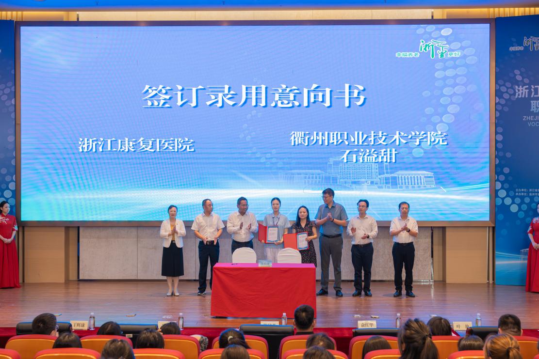竞赛期间特别组织的就业对接会,吸引了七家省内康养领域头部机构和企业参与,浙江康复医院与石溢甜同学在闭幕式上成功签订就业意向书,这也是我校2026届毕业生第一个签约就业学生。