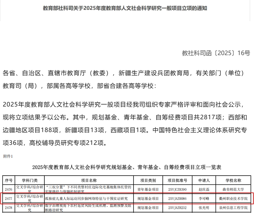 近日,教育部社科司公布了2025年度教育部人文社会科学研究一般项目立项结果,我校医学院李可峰教授主持的《孤独症儿童人际运动同步脑网络特征与干预实证研究》项目成功获批规划基金项目。